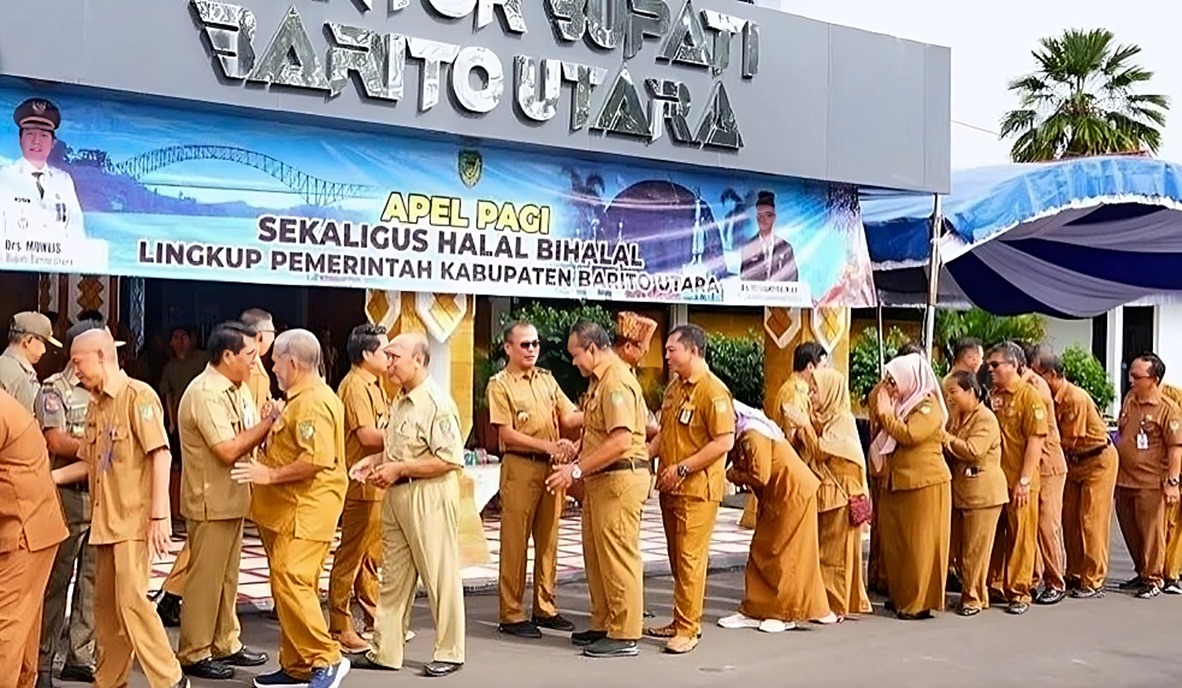 wajahb👁️rneo.com, Barito Utara — Pemerintah Kabupaten Barito Utara menggelar apel pagi sekaligus halal bihalal yang diikuti oleh seluruh ASN di lingkungan Pemkab Barito Utara diselenggarakan di halaman kantor Bupati, Selasa, 8 April 2025.