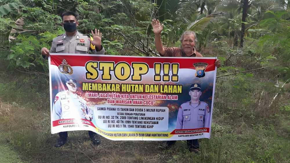 Bhabinkamtibmas juga mengingatkan pentingnya pencegahan karhutla di wilayah desa serta memberikan sosialisasi tentang ancaman pidana jika melakukan pembakaran hutan dan lahan.