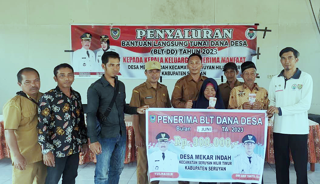 Saat menyerahkan BLT-DD, Camat didampingi Pj Kades Mekar Indah, Dwi Arif Yanto, perangkat desa, Badan Permusyawaratan Desa (BPD).