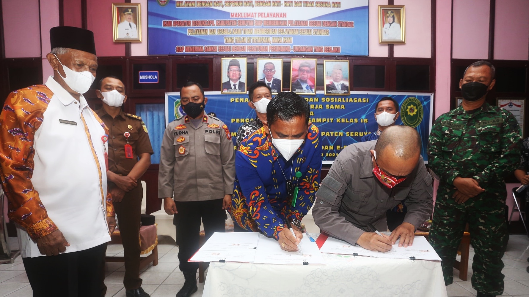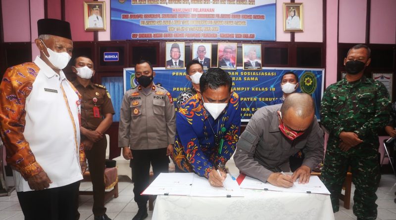 WAJAHBORNEO.com, Seruyan – Bupati Seruyan Yulhaidir dan Ketua Pengadilan Negeri Sampit Darminto Hutasoit menandatangani perjanjian kerjasama antara Pemerintah Daerah (Pemda) Kabupaten Seruyan dengan Pengadilan Negeri Sampit, tentang aplikasi “Siap Paduka” dan “E-Besuk” di Kantor Dinas Kependudukan dan Catatan Sipil (Disdukcapil) Seruyan, Kuala Pembuang Kecamatan Seruyan Hilir, Kabupaten Seruyan, Kamis 28 Oktober 2021.