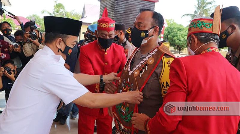 BUPATI SERUYAN yang juga Ketua Dewan Adat Dayak (DAD) Kabupaten Seruyan, Yulhaidir menyematkan pakaian adat kepada Kapolda Kalimantan Tengah Irjen Pol Dr. Dedi Prasetyo saat melaksanakan kunjungan kerja di Kuala Pembuang, Kabupaten Seruyan, Kamis 11 Februari 2021. Foto/Prokom Setda
