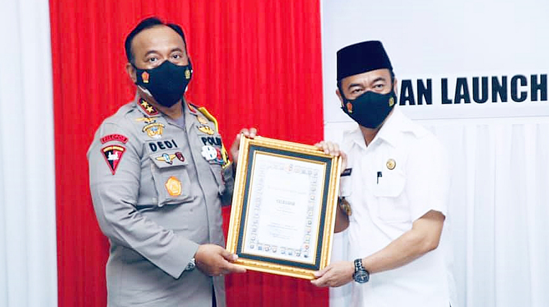 BUPATI SERUYAN Yulhaidir menerima penghargaan dari Kapolda Kalteng Irjen Pol Dr. Dedi Prasetyo ketika melaksanakan kunjungan kerja di Kuala Pembuang, Kabupaten Seruyan, Kamis 11 Februari 2021. Foto/Prokom Setda