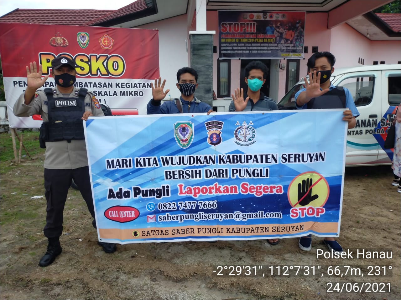 WAJAHBORNEO.com, Seruyan – Personel Polsek Hanau Polres Seruyan, melaksanakan sosialisasi dengan menggunakan spanduk dan bertemu para warga secara langsung dan mensosialisasikan tentang Saber Pungli kepada masyarakat Desa Pembuang Hulu 1 Kec. Hanau Kab. Seruyan Prov. Kalteng, Kamis (24/06/2021)