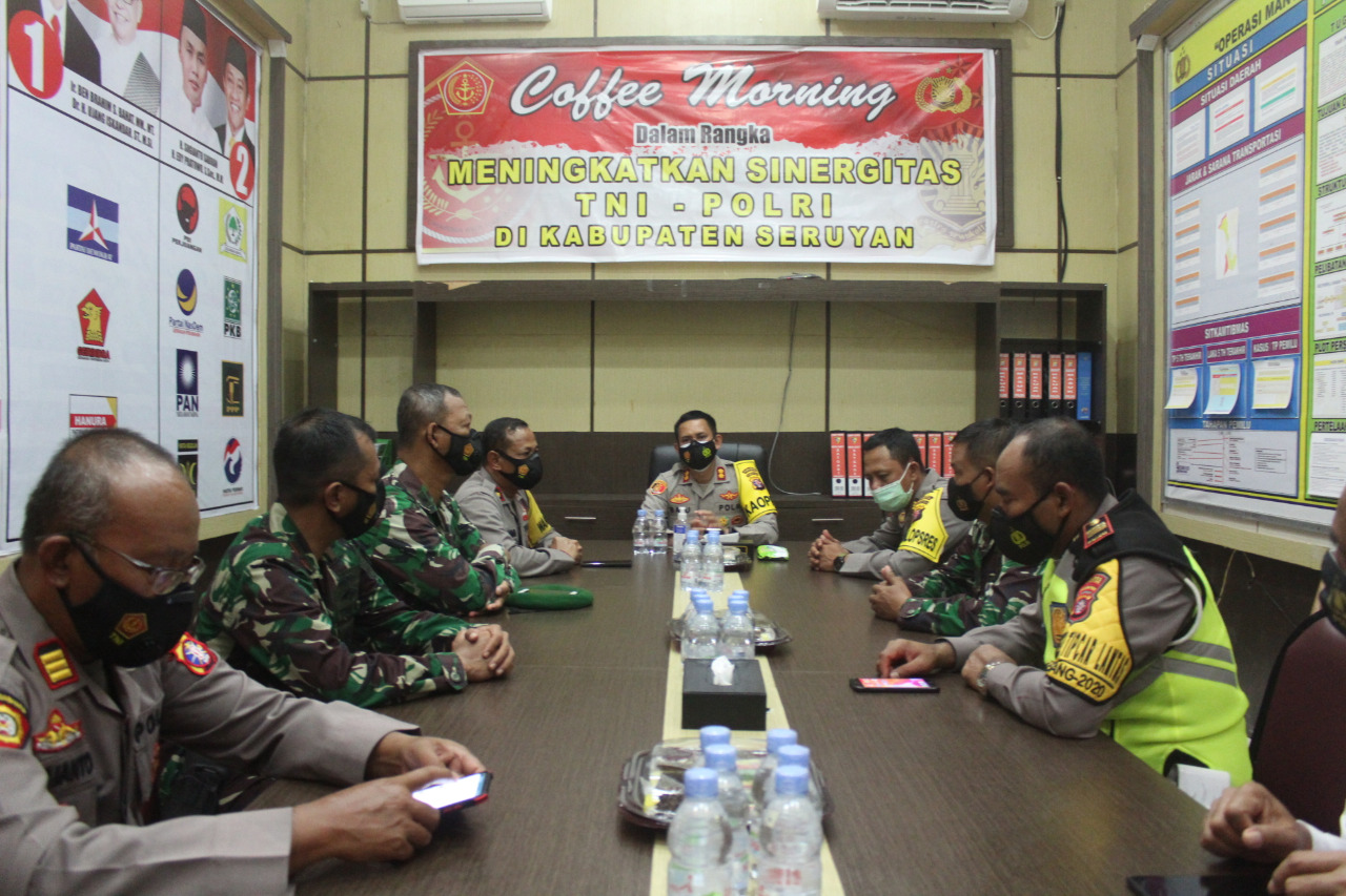 Rabu (3/3/2021) pukul 09.00 WIB, Polres Seruyan menggelar Coffee Morning sinergitas TNI Polri yang dipimpin Kapolres Seruyan AKBP Bayu Wicaksono, S.H., S.I.K., M.Si dan Pabung Kodim 1015 Sampit Mayor Arh Bambang Waluyo dan dikuti prjabat utama Polres Seruyan dan personel TNI di Aula Data Polres Seruyan, Jalan A Yani Kuala Pembuang Kabupaten Seruyan Provinsi Kalteng.