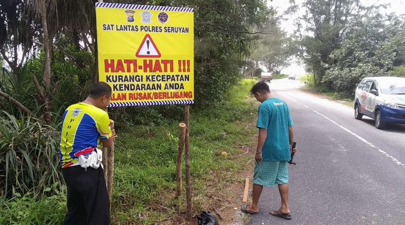 WAJAHBORNEO.com, Seruyan – Guna menyadarkan para pengguna lalu lintas di jalan raya agar berhati- hati saat berkendara, anggota kepolisian dari Resor Seruyan Polda Kalimantan Tengah lakukan Pemasangan Spanduk “Jalan Rusak atau berlubang” di sejumlah tempat.