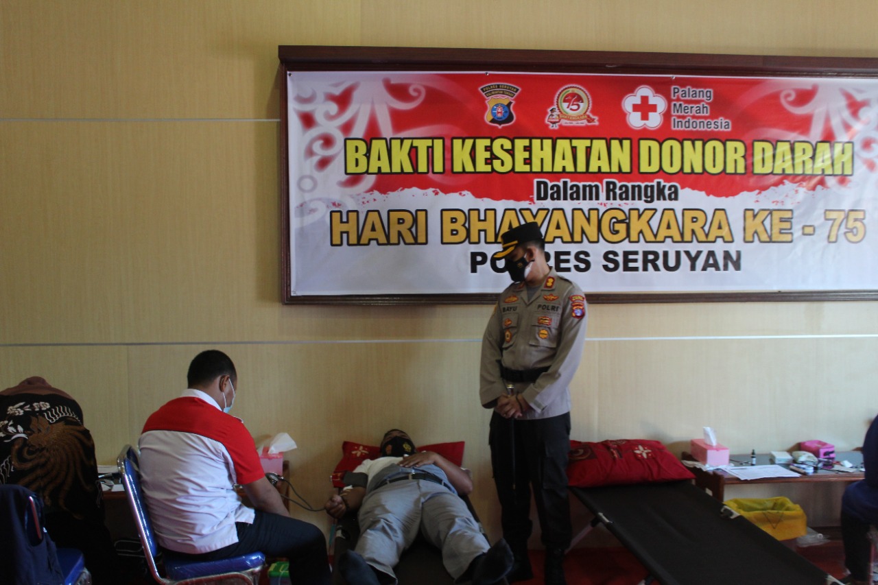 WAJAHBORNEO.com, Seruyan – Dalam rangka memperingati dan memeriahkan Hari Bhayangkara ke-75 tahun 2021 Polres Seruyan melaksanakan kegiatan Bakti Kesehatan berupa Donor Darah, Kapolres Seruyan AKBP BAYU WICAKSONO, S.H.,S.I.K.,M.Si yang didampingi Ketua Bhayangkari Cabang Seruyan Ny. WINA WICAKSONO melaksanakan peninjauan langsung pada pelaksanaan Donor Darah yang dilaksnakan di ruang lobby Mapolres Seruyan.