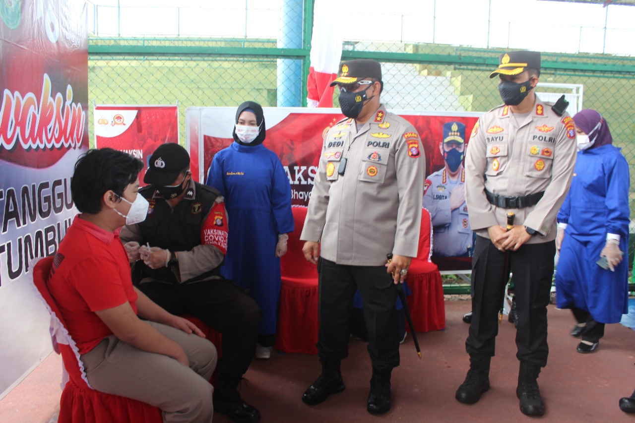 Selanjutnya Kapolda Kalteng beserta rombongan melakukan Peninjauan Kegiatan Vaksinasi Covid-19 yang diselenggarakan di Lapangan tenis Indor.