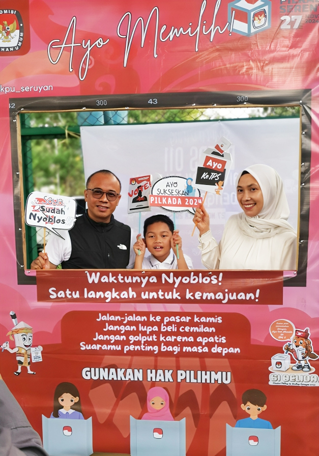 wajahb👁️rneo.com, Seruyan – Mencoblos di Tempat Pemungutan Suara (TPS) 011, lapangan Tenis Indoor, peserta Pilkada Bupati dan Wakil Bupati Seruyan 2024, nomor urut 1, Muhammad Muhklis melaksanakan hak pilihnya didampingi istrinya Al Hikmah, Rabu, 27 November 2024.