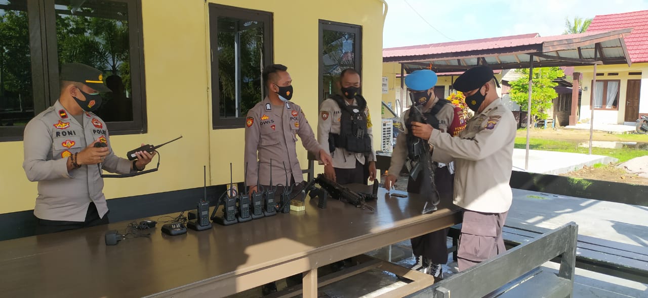 Kapolsek melakukan pengecekan kelengkapan dan kondisi HT serta senjata api (senpi) dinas beserta munisi yang digunakan dalam tugas penjagaan mako maupun kegiatan patroli dan penangan TKP (tempat kejadian perkara).