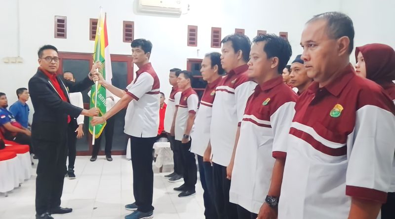 KETUA PENGPROV PBSI Kalteng, Sugiyanto menyerahkan bendera PBSI Kepada Ketua PBSI Seruyan, Mulyo Supriyatno saat dilantik di Aula Dispora Seruyan, Minggu, 26 Februari 2023. Foto/wajahborneo.com
