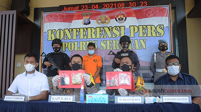 Kapolres Seruyan, AKBP Bayu Wicaksono didampingi Wakapolres Seruyan Kompol Yudha Setiawan, Kasatresnarkoba Ipda Andri W Kasnar, Kasubag Humas Polres AKP I Gede Suarmayasa saat konferensi pers di Mapolres Seruyan, Jumat, 23 April 2021 mengatakan, penangkapan Pjr alias Ocon terjadi pada Minggu tanggal 18 April 2021.