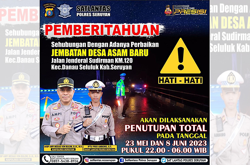 “Kami mendukung upaya pemerintah untuk melakukan penggantian grider dan lantai jembatan pile slab Asam Baru,” kata Kasatlantas Polres Seruyan, Iptu Prio Amboro, Senin, 15 Mei 2023.