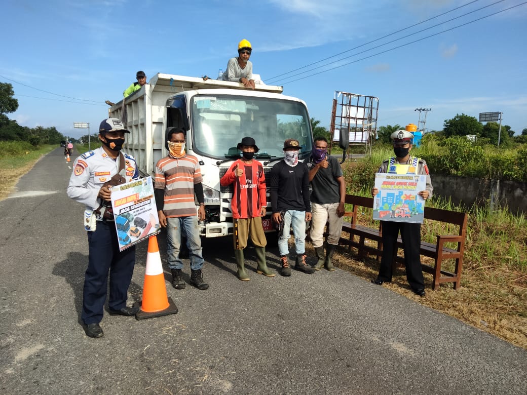 Dipimpin Kasatlantas Iptu Moch. Romadhon, S.H., petugas membagi-bagikan stiker Dilarang Mudik Lebaran 2021, melaksanakan kegiatan Safety Riding and Driving dan membagikan masker di Kuala Pembuang, Selasa (11/05/2021).