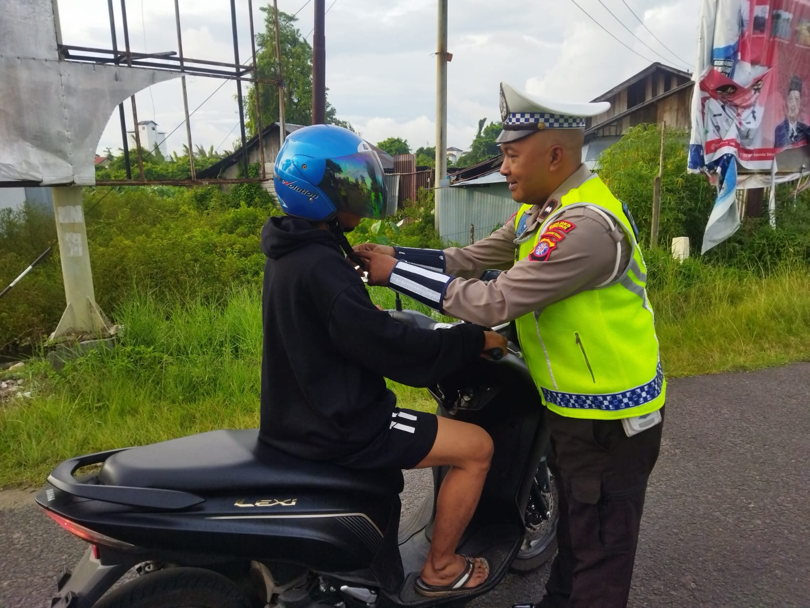 Pada kegiatan tersebut dilaksanakan dengan imbuan secara humanis serta membantu mengancingkan Helm pengendara sepeda motor hingga bunyi “Klik“, ujar Prio.